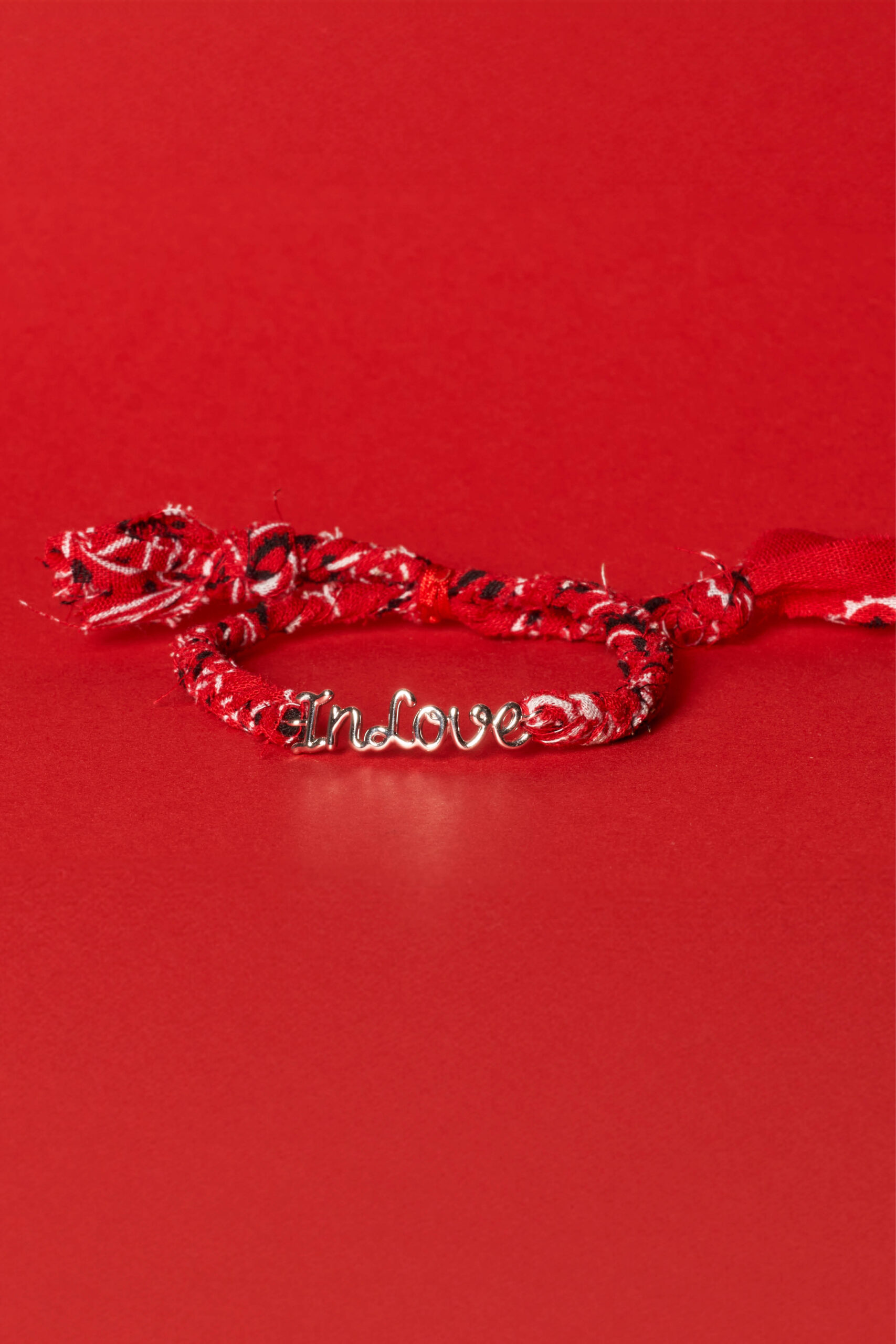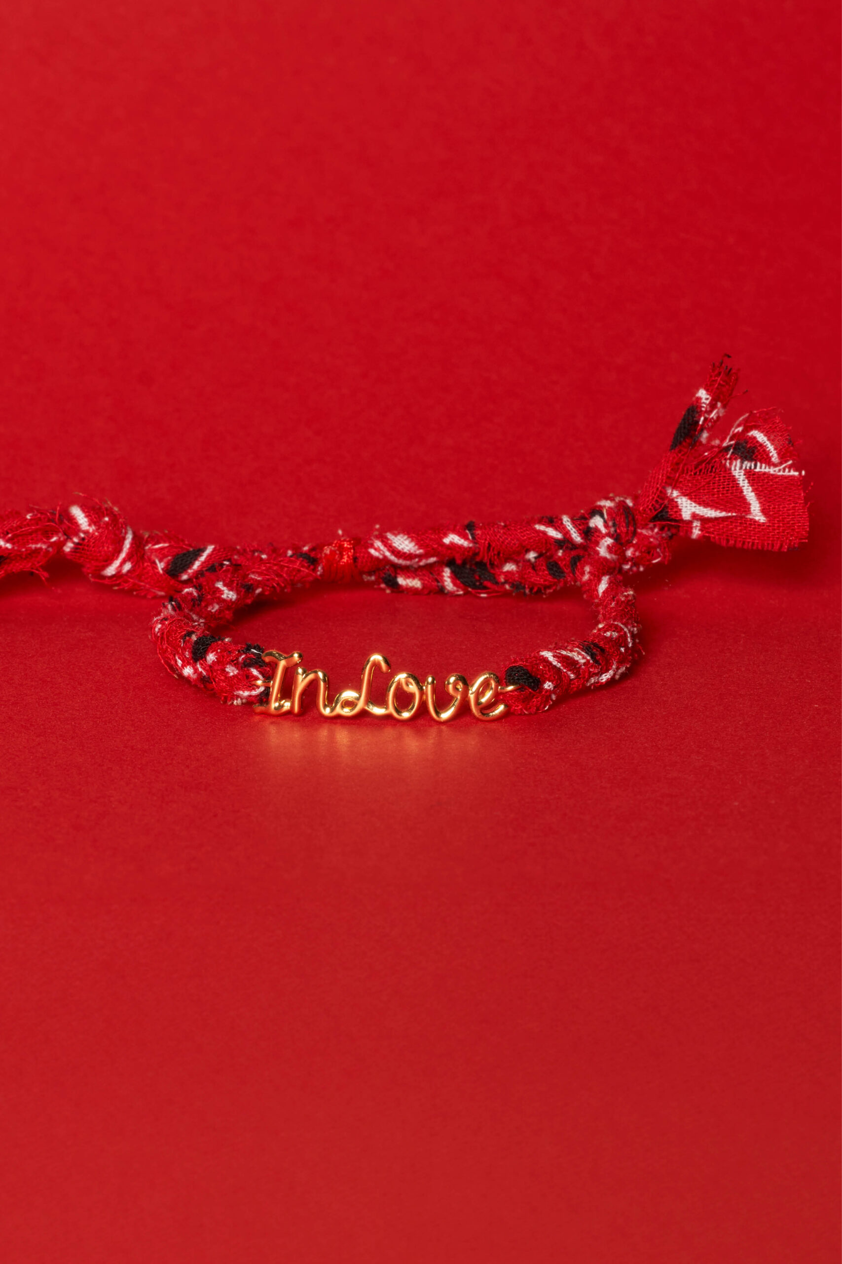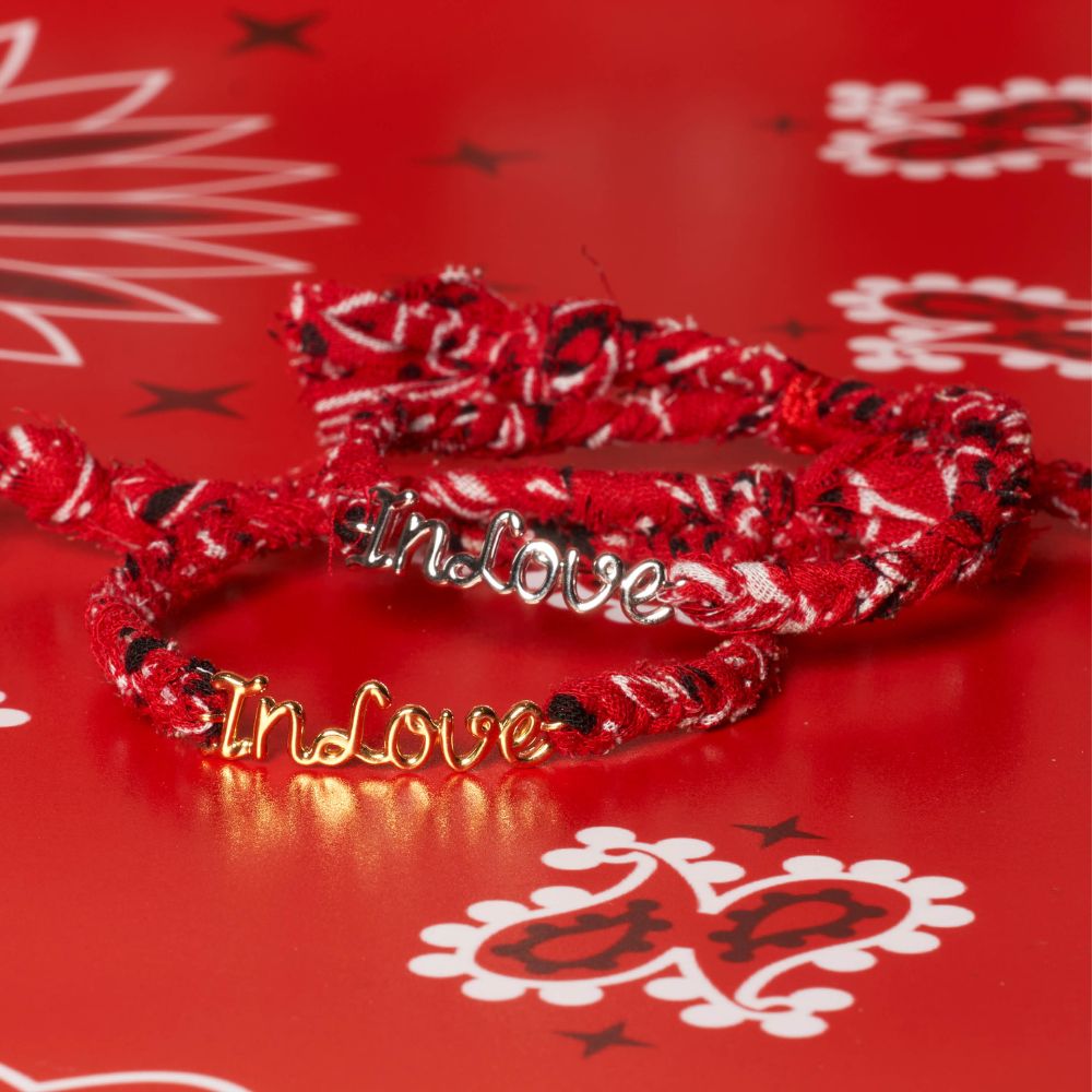 Un bandana tressé rouge pour la touche bohême chic de Made in Fun et une plaque « In Love » pour le détail joaillerie de Thea Jewelry : notre nouveau bracelet est clairement le grigri fétiche qui ne va plus quitter votre poignet.