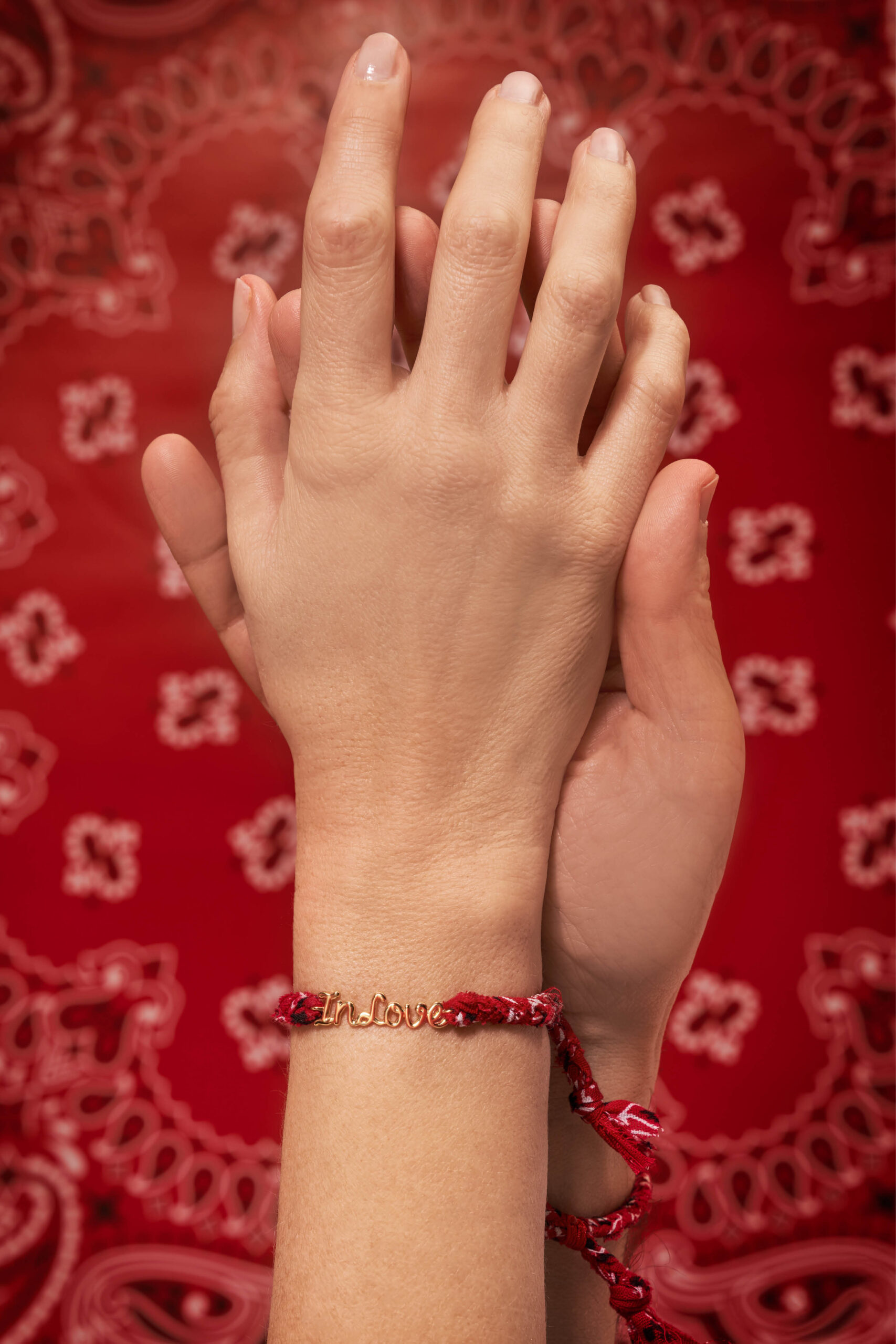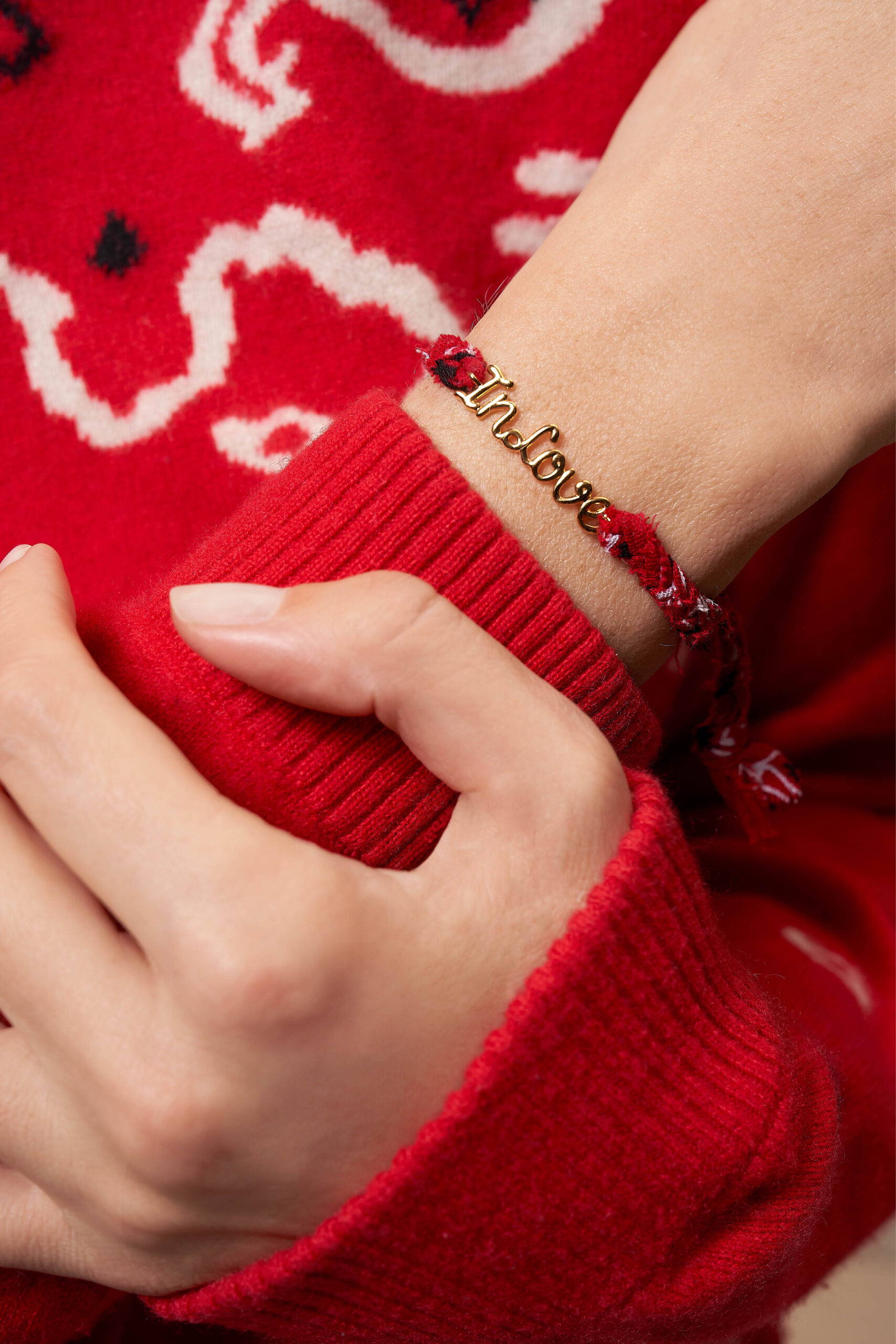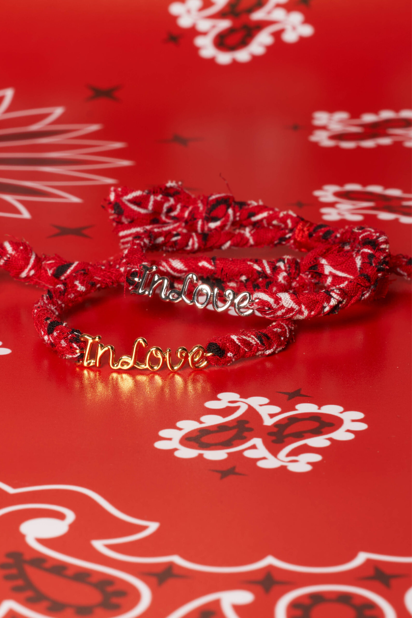 Un bandana tressé rouge pour la touche bohême chic de Made in Fun et une plaque « In Love » pour le détail joaillerie de Thea Jewelry : notre nouveau bracelet est clairement le grigri fétiche qui ne va plus quitter votre poignet.