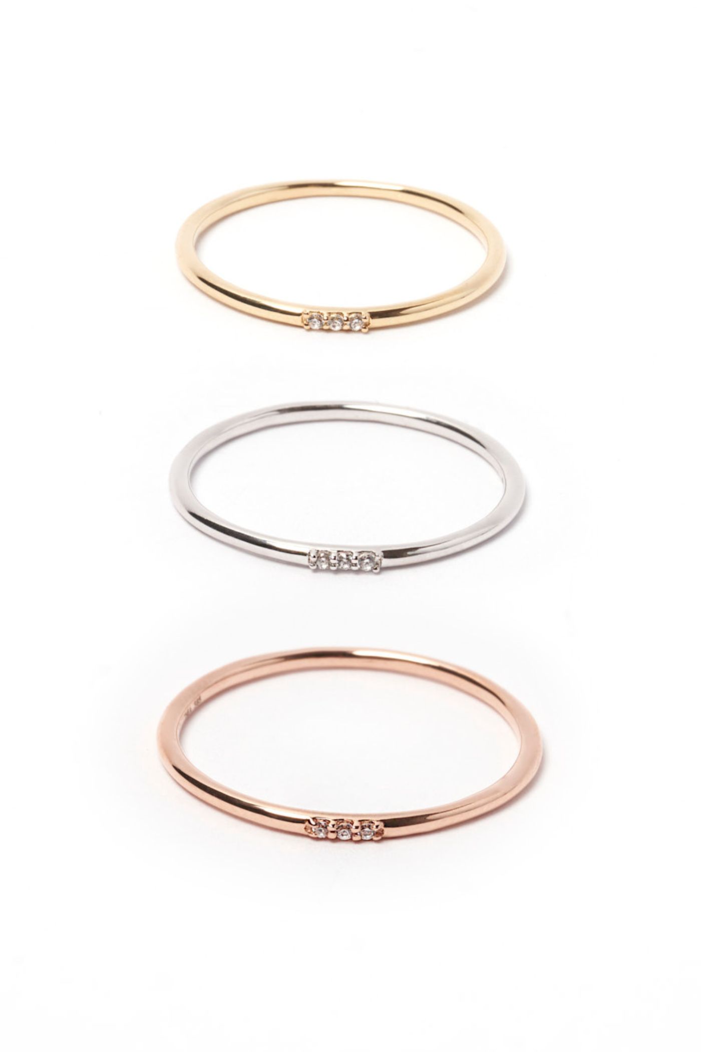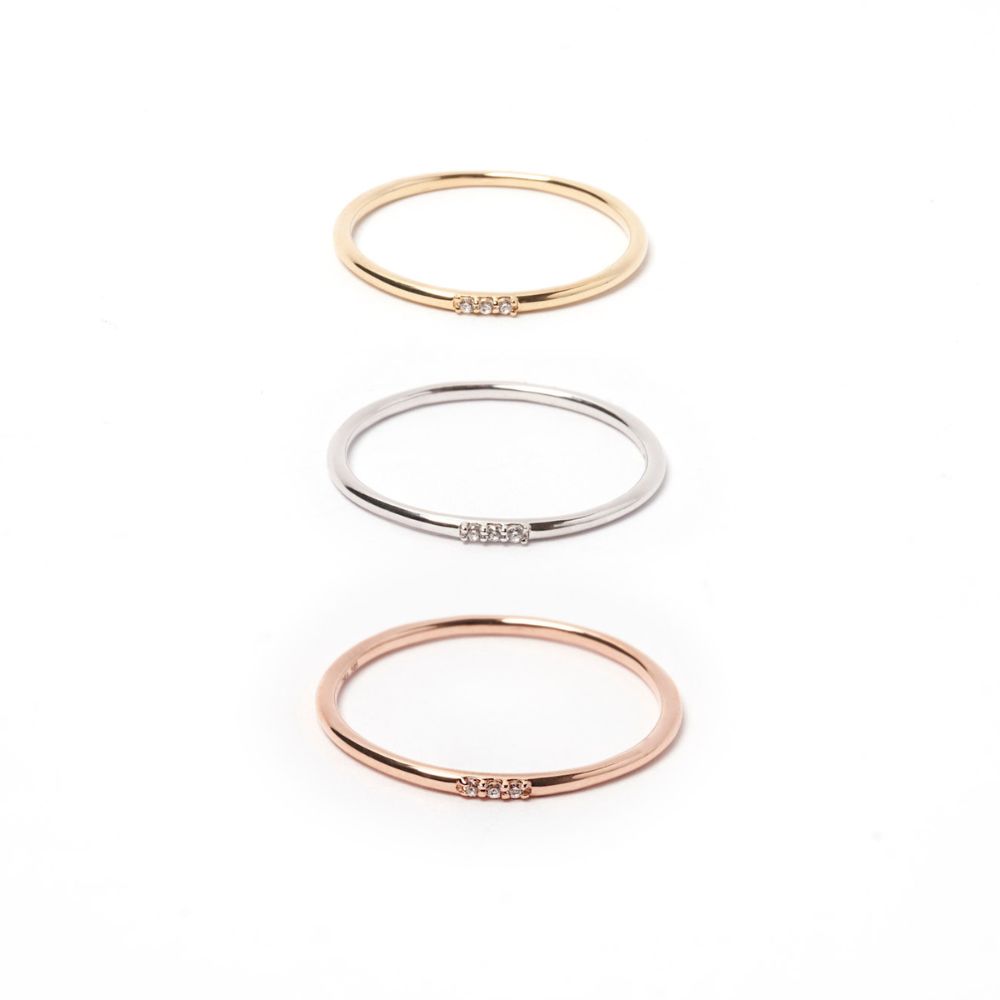 Elles sont en or 14 carats et 3 zircons, disponible dans les 3 or (blanc-jaune-rose) et en 4 tailles (50, 52, 54 et 56).