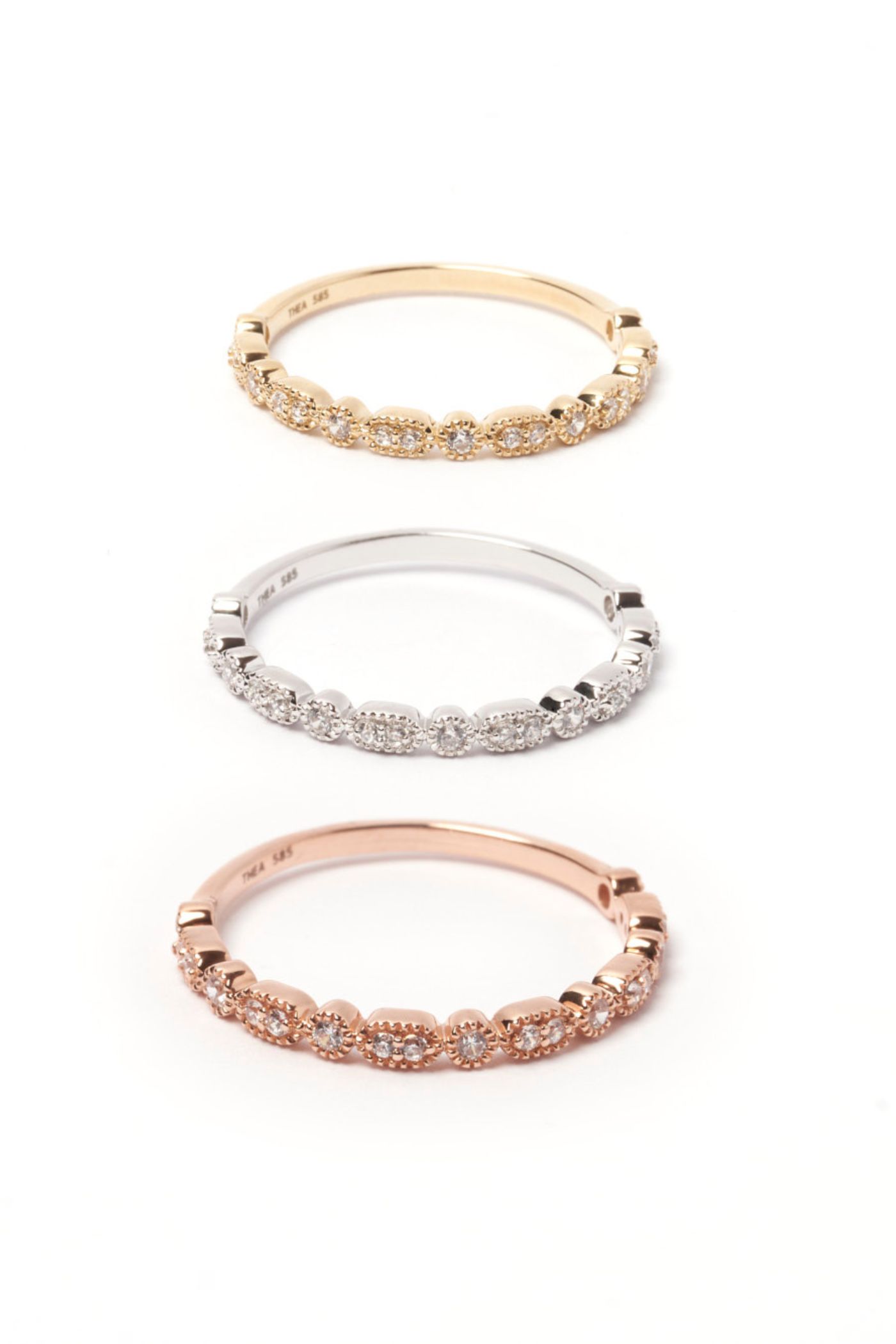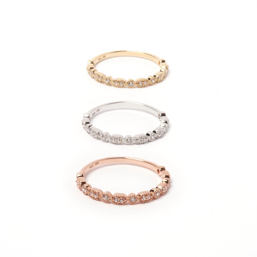 Elles sont en or 14 carats et 19 zircons, disponible dans les 3 or (blanc-jaune-rose) et en 4 tailles (50, 52, 54 et 56).
