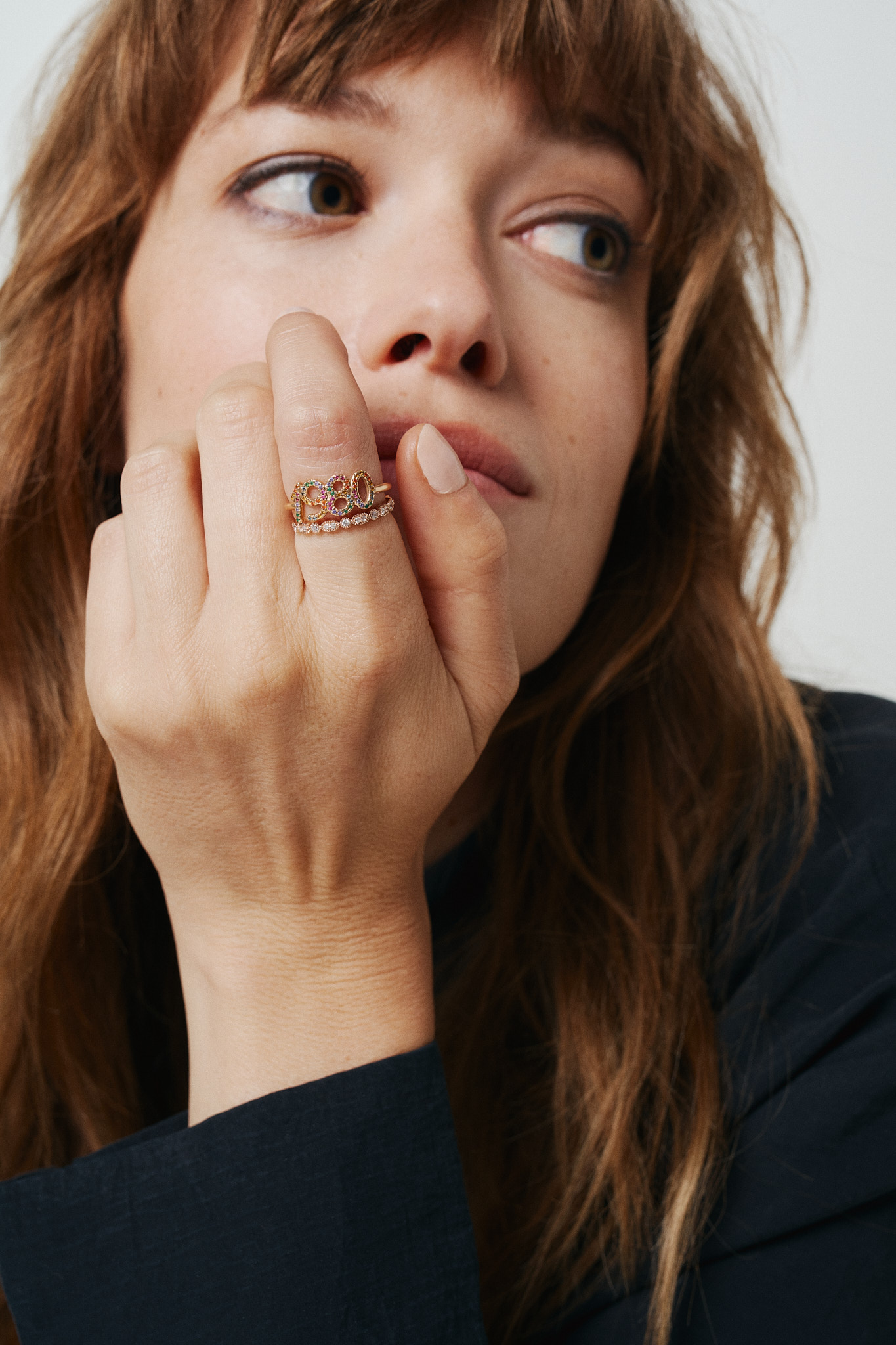 Le conseil d’Emilie : c’est notre alliance retravaillée, mais surtout c’est la plus romantique de la collection. Elle se porte aussi en duo avec des bagues signatures de Thea dont les lettres montent vers le haut en majuscules ou en minuscules style 12h21, laura, Paris…